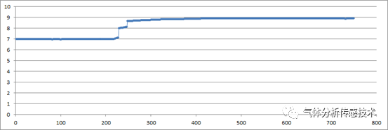 測(cè)試響應(yīng)速度,當(dāng)模組通入7ppm標(biāo)氣穩(wěn)定后,通入9ppm標(biāo)氣,數(shù)據(jù)變化趨勢(shì)如圖5所示。橫坐標(biāo)為時(shí)間,單位秒,縱坐標(biāo)為濃度,單位ppm。從數(shù)據(jù)來(lái)看該模塊t90響應(yīng)時(shí)間在30S以內(nèi)。