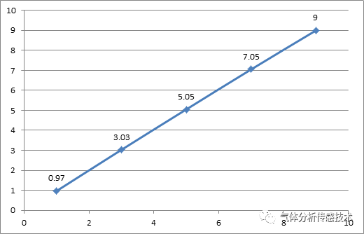 對(duì)于0~10ppm的檢測(cè)模塊,分別通入1、3、5、7、9ppm的標(biāo)氣,通氣3分鐘后記錄數(shù)據(jù),測(cè)試數(shù)據(jù)如圖1所示。最大絕對(duì)誤差0.05ppm,小于量程的1%FS。