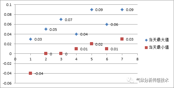 我們將0~10ppm量程的CO2模塊在室內(nèi)自然環(huán)境中連續(xù)運(yùn)行7天,期間以200ml/min不間斷通入氮?dú)猓刻煊^察數(shù)據(jù)的波動(dòng)區(qū)間,找出最大最小值,測(cè)量結(jié)果如圖3所示。從實(shí)測(cè)數(shù)據(jù)可見,24小時(shí)最大最小不超過(guò)0.1ppm,模組運(yùn)行7天最大最小值差為0.13ppm。