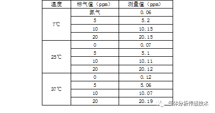 將0~10ppm的CO2模塊放于溫箱中,將溫箱的溫度設(shè)置為25℃,待溫度穩(wěn)定后,通入氮?dú)狻?ppm、10ppm和20ppm,記錄結(jié)果。然后依次將溫箱溫度設(shè)定為7℃、37℃,待溫度點(diǎn)穩(wěn)定后,通入氮?dú)狻?ppm、10ppm和20ppm氣體,分別記錄結(jié)果。最后結(jié)果如表2所示??梢娫?~37℃范圍內(nèi),最大偏差為0.14ppm。