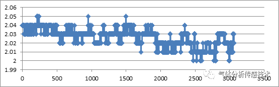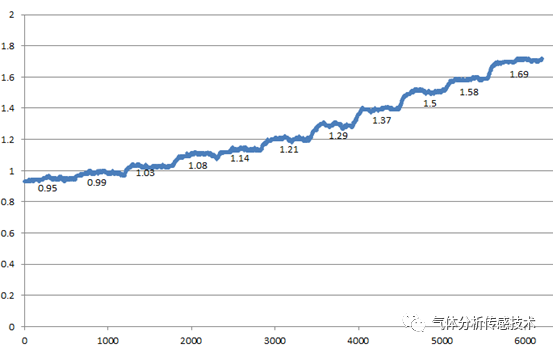 模組上電預(yù)熱穩(wěn)定后,通氣測(cè)試模組的實(shí)際分辨率。通過(guò)配氣機(jī)分別配通入1ppm、1.05ppm、1.1ppm、1.15ppm、1.2ppm、1.25ppm、1.3ppm、1.4ppm、1.5ppm、1.6ppm、1.7ppm的氣體,檢測(cè)結(jié)果如圖2所示,模組實(shí)際分辨率優(yōu)于0.05ppm,縱坐標(biāo)為濃度值,橫坐標(biāo)為數(shù)據(jù)點(diǎn)數(shù)。