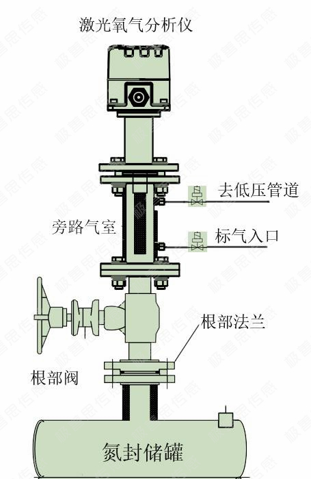 如圖所示,在氮封罐的根部法蘭上安裝一個根部閥,然后將激光氧氣分析儀旁路安裝在旁路氣室內(nèi)。旁路氣室上設有標氣入口和去低壓管道的出口,底部法蘭部分開有進氣口。氮封罐內(nèi)一般為微正壓或微負壓(排液時),氣體可以連續(xù)進入旁路氣室,實現(xiàn)連續(xù)測量。