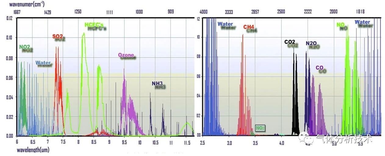 圖1 常見氣體在不同波長(zhǎng)的吸收譜線圖