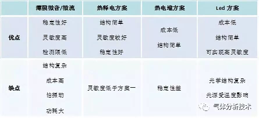 檢測(cè)器方面一般采用設(shè)計(jì)構(gòu)思巧妙的薄膜微音器和微流。薄膜微音器是在檢測(cè)器中密封被測(cè)氣體,利用被測(cè)氣體吸收光能后的熱脹冷縮導(dǎo)致薄膜震動(dòng),產(chǎn)生有用信號(hào)。微流采用類似原理,在檢測(cè)器中密封進(jìn)被測(cè)氣體,利用被測(cè)氣體吸收光能后的熱脹冷縮導(dǎo)致檢測(cè)器內(nèi)部氣體在兩個(gè)相通的小腔內(nèi)流動(dòng)形成微流,從而帶走通道上發(fā)熱的電阻絲的熱量,導(dǎo)致電阻變化形成有用信號(hào)。