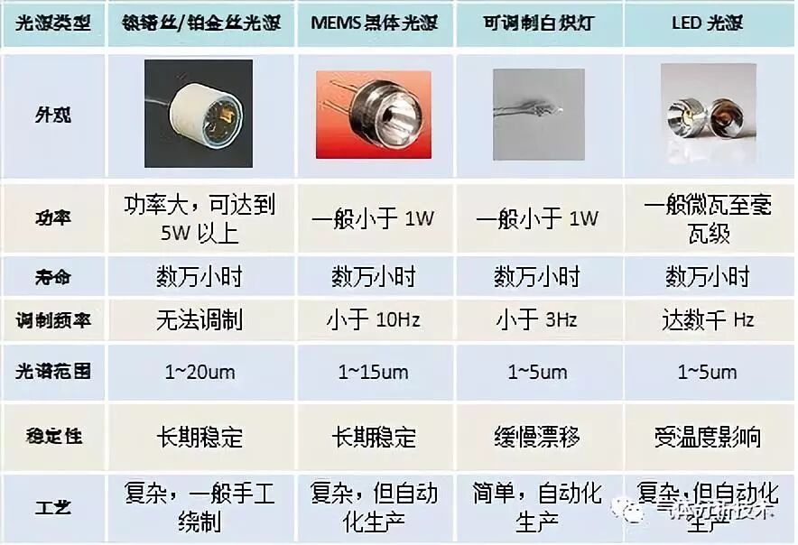 按照檢測(cè)器實(shí)現(xiàn)方式不同包括薄膜微音檢測(cè)器、微流檢測(cè)器、熱釋電檢測(cè)器、熱電堆檢測(cè)器、PD管;按照光源分為繞制鎳鮥絲和鉑金絲光源、可調(diào)制小白熾燈、MEMS黑體可調(diào)制光源、可高頻調(diào)制led光源。氣室根據(jù)是否設(shè)置參考通道分為單通道和雙通道。(1)紅外光源紅外氣體分析中可用的光源如表1所示。